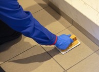 1.施工範囲外を養生した後、玄関まわりを簡易清掃してクリーニングします。